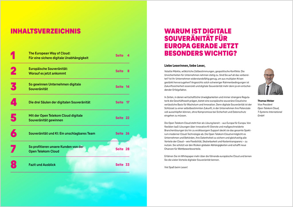 Erfahren Sie im neuen Whitepaper der T Cloud Public, warum Europas digitale Unabhängigkeit immer wichtiger wird und welche Rolle souveräne Cloud-Lösungen dabei spielen. Das Whitepaper liefert fundierte Zahlen zu den Wünschen und Anforderungen von Unternehmen, beleuchtet zentrale Erfolgsfaktoren wie offene Standards und Datenschutz und zeigt, wie die T Cloud Public konkrete Mehrwerte schafft – von Branchenlösungen bis zu KI-Anwendungen. Profitieren Sie von praxisnahen Einblicken, aktuellen Marktdaten und Kundenbeispielen. Jetzt kostenlos herunterladen und mehr über den „European Way of Cloud“ erfahren!