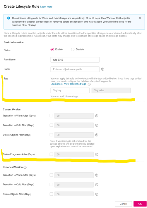 You can now use the lifecycle rules of the Object Storage Service to control a lifecycle policy via tags. This makes it possible to only delete objects or transfer them to other storage classes when a previously defined tag have been assigned. This allows the data in OBS to be managed more cost-efficiently in a variety of ways.